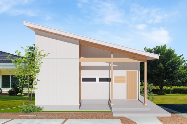 ブラックのガルバリウムの外壁に梁と柱が調和した数十年後も飽きのこないシンプルなファサード。大胆な勾配天井は平屋ならではの、遊びごころが魅力です。